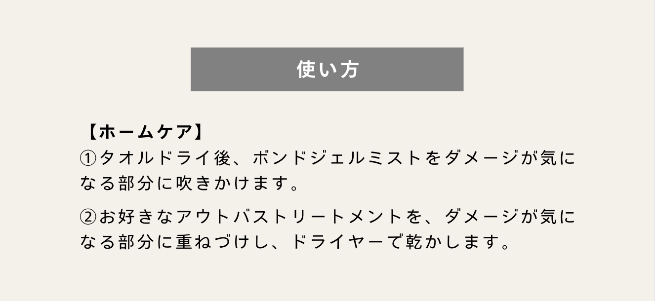 また、アホ毛や表面のふわふわした毛が気になる方は、ボンドジェルミストを手にシュッと出し、馴染ませドライヤーで乾かしていただくのがおすすめ!!
