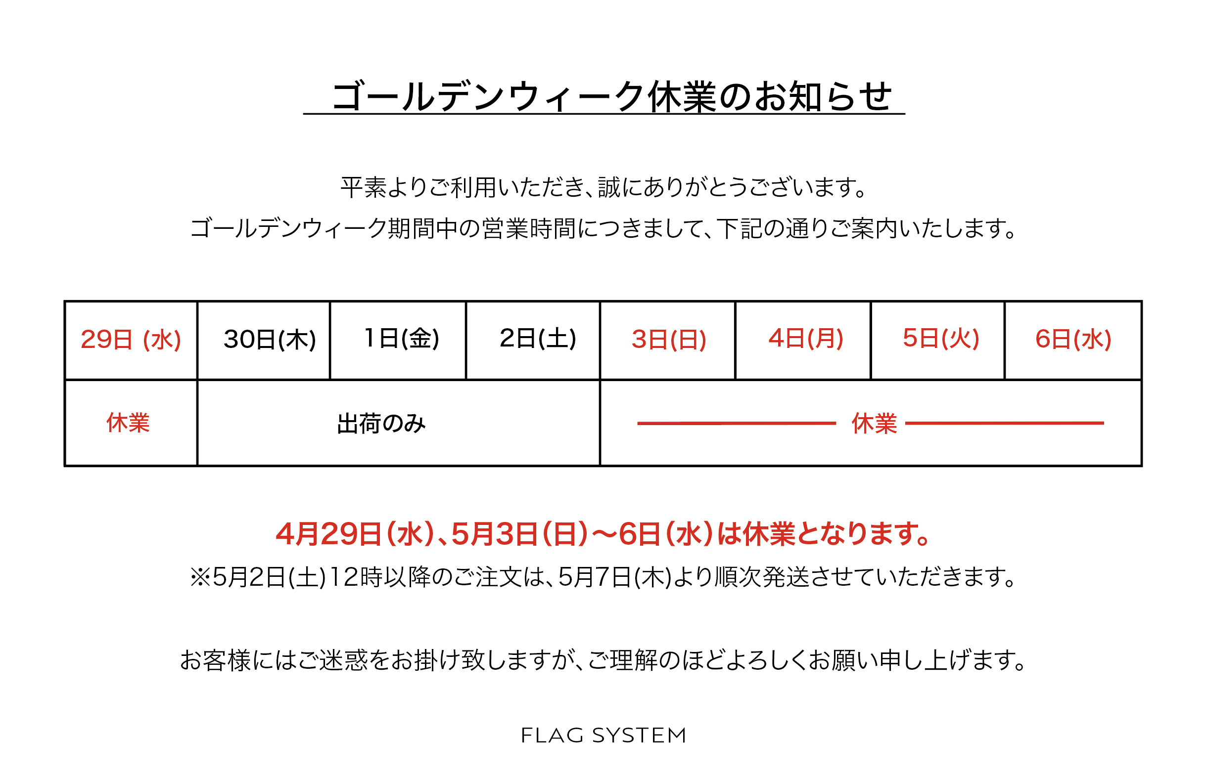 ゴールデンウィーク休業のお知らせ